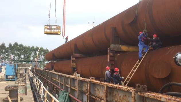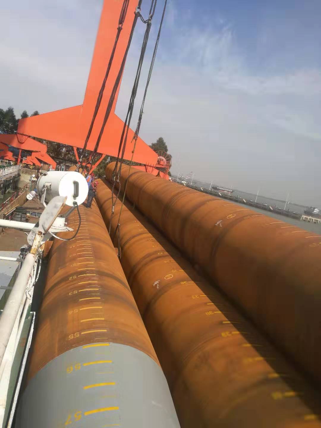 據(jù)介紹,由于群樁的管樁長度達70余米,上下口徑分別達2.4米和2.9米,單重180T左右,四根管樁需要分兩層裝載,下層兩根管樁吊運上船固定在甲板之后,還需要臨時焊接上層支撐架才能進行裝放另兩根管樁,所以管樁裝運看似簡單,實際卻非常耗費時間和精力。