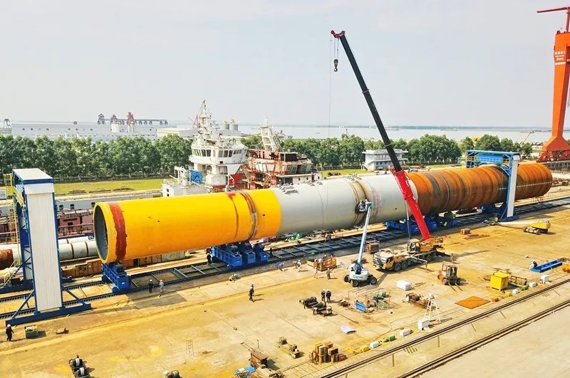 公司的生產場地面積超過70萬平方米,擁有海上風電導管架、基礎鋼管樁、大直徑單樁和穩(wěn)樁平臺等產品生產線: