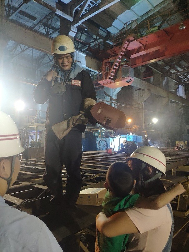 魯雄信是海洋工程部鉚焊工班的一名船舶電焊工,他的妻子每天既要工作,又要照顧年幼的孩子。在這次前往施工現(xiàn)場(chǎng)看望魯雄信之前,她對(duì)丈夫的工作不甚了解。路上,孩子時(shí)不時(shí)問媽媽:“爸爸在哪呀?”魯雄信的妻子一邊安撫孩子馬上就要見到爸爸了,一邊說,(項(xiàng)目緊張的時(shí)候)魯雄信時(shí)常加班,八九點(diǎn)才能到家,孩子很黏他爸爸。