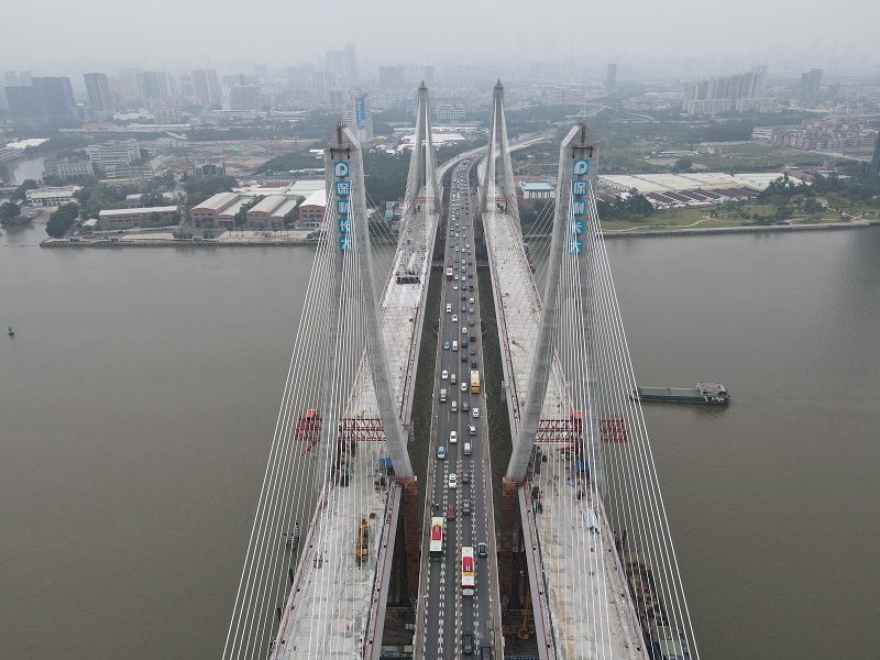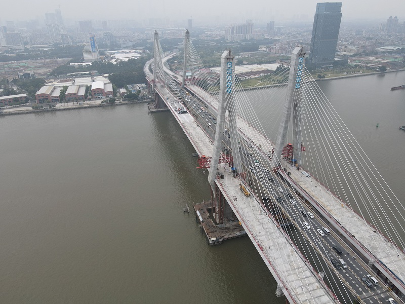 洛溪大橋始于1988年通車,是連接海珠區(qū)與番禺區(qū)的重要過江通道,隨著改革開放社會經(jīng)濟發(fā)展,車流量日益增長,四車道遠不足以解決交通擁堵問題。2017年12月,洛溪大橋拓寬工程項目啟動,計劃在現(xiàn)有的洛溪大橋東西兩側(cè)各建一座3車道的雙塔雙索面疊合梁斜拉橋。該項目完成后,洛溪大橋雙向共有10車道,將有效解決交通擁堵問題,也將為廣州城市景觀增添一道靚麗的風(fēng)景線。