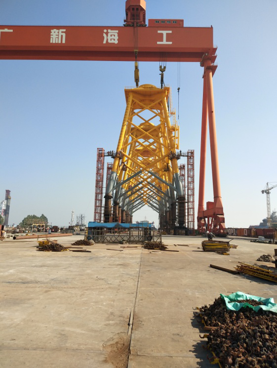 經(jīng)過幾天的充分準(zhǔn)備,12月12日上午,隨著現(xiàn)場指揮人員的一聲令下,中山基地外場600T吊機(jī)吊著最后一套——38#風(fēng)電基礎(chǔ)導(dǎo)管架的下段徐徐升起、緩緩移動,與已安裝在運(yùn)輸工裝上面的下段進(jìn)行精準(zhǔn)合攏對接。經(jīng)施工人員迅速焊接加固后,隨著吊鉤的移開,標(biāo)志著合攏總組吊裝順利完成,也標(biāo)志著中山基地今年導(dǎo)管架生產(chǎn)進(jìn)入了最后的沖刺階段!